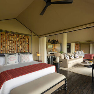 There are 12 luxury tented suites catering for a maximum of 24 guests at any one time. Each tented suite sits on a raised platform and includes a spacious bedroom with en-suite bathroom, sitting area and a large deck with breath-taking views over the landscape – perfect for spotting the game that will almost certainly wander into view!