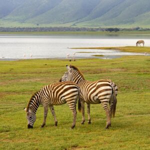 The Ngorongoro Crater is the world’s largest inactive, intact, and unfilled volcanic caldera . Formed two to three million years ago when a giant volcano exploded and collapsed, it creates a natural amphitheater of breathtaking beauty. The crater floor, covering 260 square kilometers, is a mosaic of grassland, swamps, forests, and a soda lake that attracts thousands of flamingos .